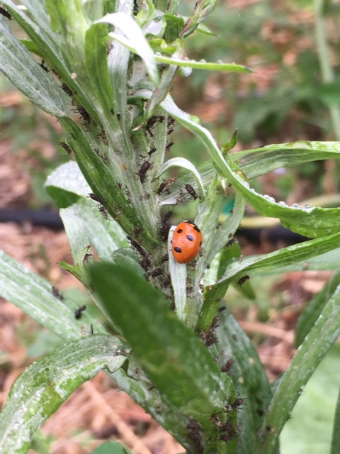 En cas d’attaque de nuisible, nous nous contentons d’observer le travail des « auxiliaires ». Prenons l’exemple des pucerons et des coccinelles. Une attaque de pucerons est souvent très impressionnante, nous avons peur pour le ou les plants envahis. Notre instinct protecteur nous pousserait à agir, alors que si nous attendons quelques jours de plus, nous avons le plaisir de voir arriver quelques coccinelles, qui vont certes manger, mais surtout pondre, et la semaine suivante, le plant sera couvert de larves voraces qui nettoieront le plant de tous ces pucerons en quelques jours… et nous avons une armée d’auxiliaires à disposition dans notre jardin!